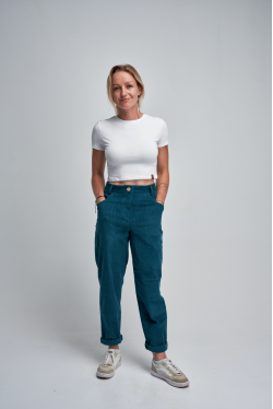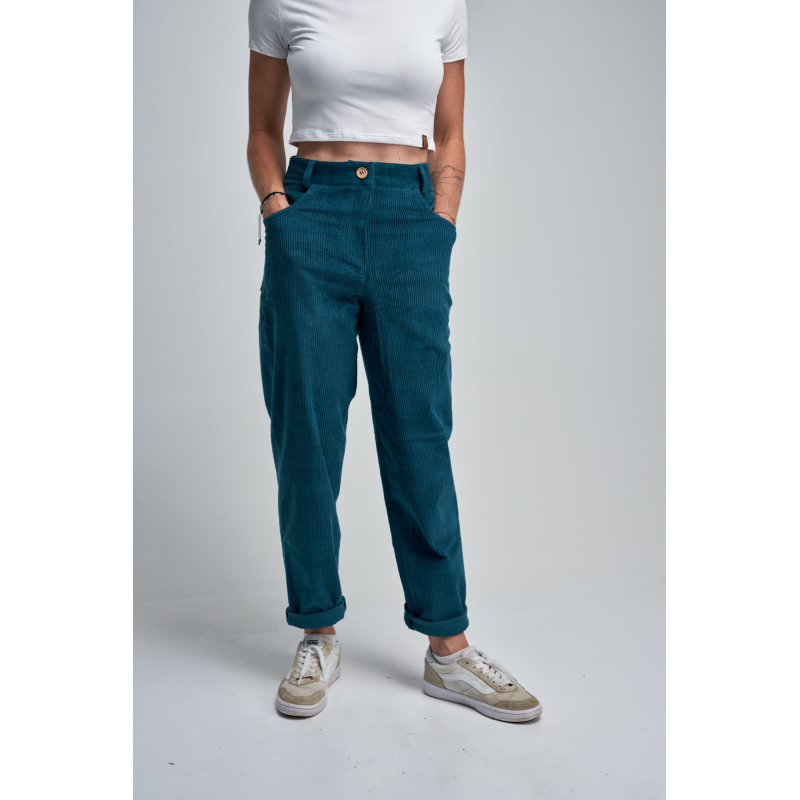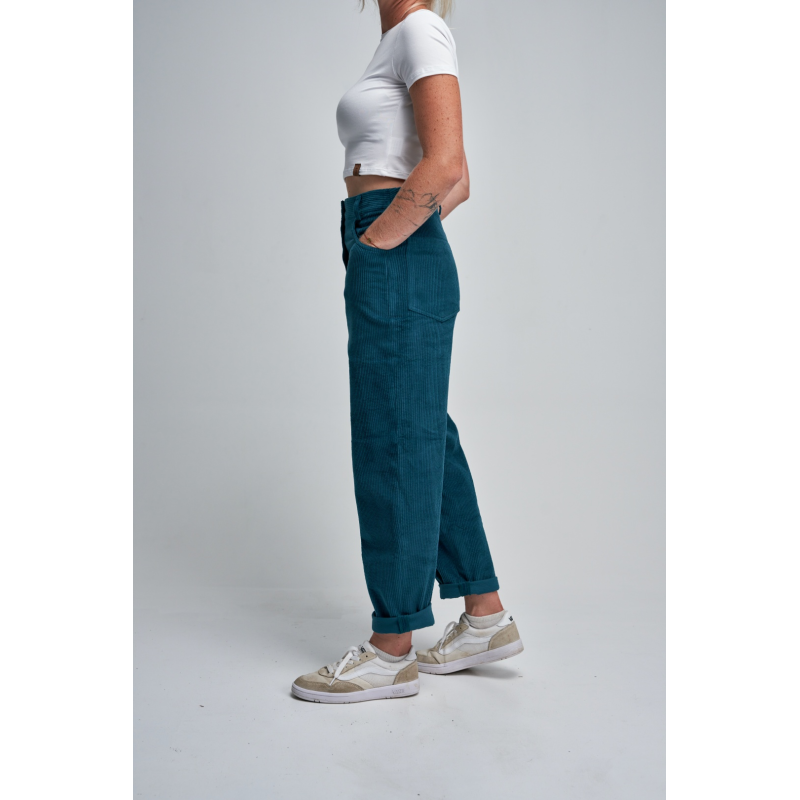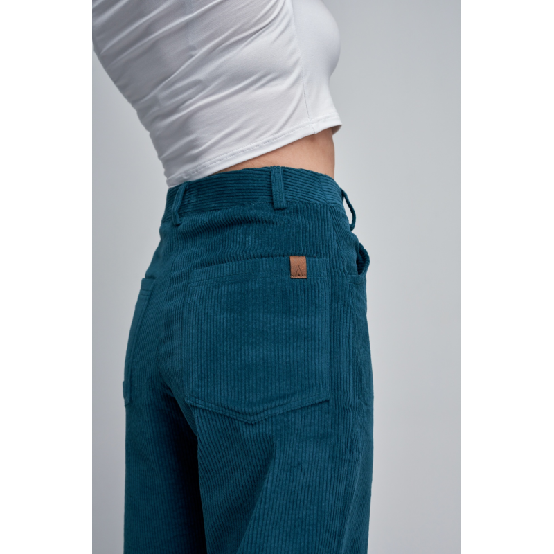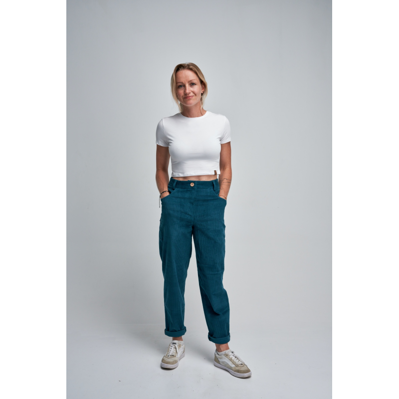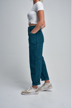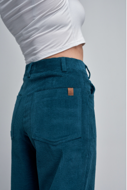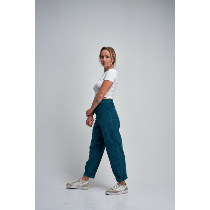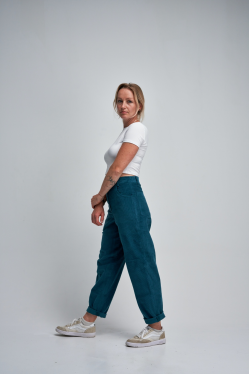 Stylové manšestrové kalhoty ve střihu mom-jeans kombinují pohodlí a nadčasový vzhled – skvěle padnou mladším i starším. Příjemný, měkce strukturovaný materiál doplňuje dřevěný knoflík a příjemný petrolejový odstín, který se hodí ke všemu. Ideální volba pro podzimní i jarní dny.